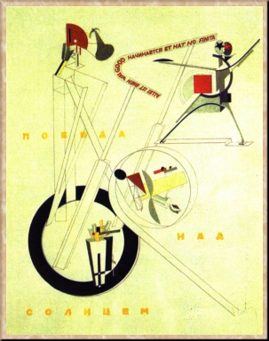 В Витебск его пригласил М. 3. Шагал, но "левый поворот" случился под влиянием Малевича, вытеснившего Шагала со сцены и превратившего тихий город в "супрематическую столицу". Лисицкий стал членом основанного Малевичем общества У повис ("Утвердители нового искусства"); формообра-зующие принципы супрематизма не только адаптировались им в массовых жанрах (плакат "Клином красным бей белых", 1920; книжка "Супрематический сказ про два квадрата", 1922), но и по-своему развивались в "проунах" ("проекты утверждения нового", 1919-24). Являясь пространственными моделями утопической архитектуры, "проуны" позволяли перевести супрематическую геометрию из плоскости в объем, в масштаб реальной городской среды - они же послужили основой неосуществленных архитектурных замыслов Лисицкого (горизонтального небоскреба, дома-коммуны, яхт-клуба). Другой формой разработки супрематических законов стали "фигурины" (сценографические эскизы) к неосуществленной постановке оперы "Победа над солнцем" (1920-21), задуманной художником как "электромеханическое шоу". Машинерия, изобретательская практика вообще занимали Лисицкого (одно из лучших его изобретений - проект передвижной ораторской трибуны 1924 г.).